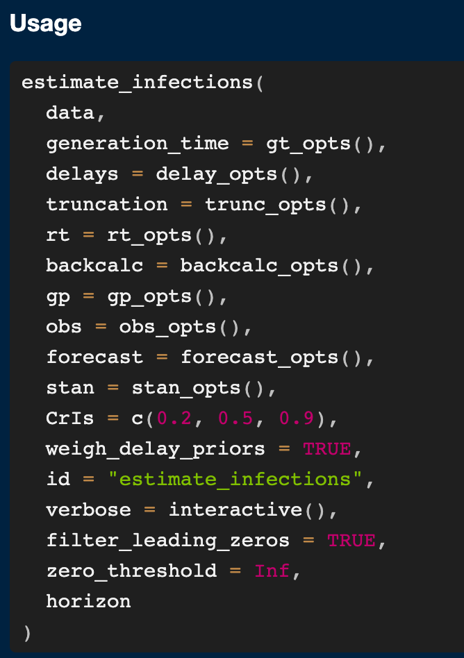 {EpiNow2} under the hoodStan backends: {rstan} and {cmdstanr}stan’s MCMC algorithmsestimate_infections(): estimate infections and \(R_t\) from reported casesestimate_secondary(): estimate secondary outcomes (hospitalisations, deaths, etc) from primary observations (cases)estimate_truncation(): estimate right truncation distribution from vintage/snapshot data for nowcastingforecast_infections(): forecast infections trajectoriesforecast_secondary(): forecast secondary outcomes (hospitalisations, deaths, etc) from primary observations (cases)simulate_infections(): simulate infections and \(R_t\) from reported casessimulate_secondary(): simulate secondary outcomes (hospitalisations, deaths, etc) from primary observations (cases)data.frame of observations. date confirm