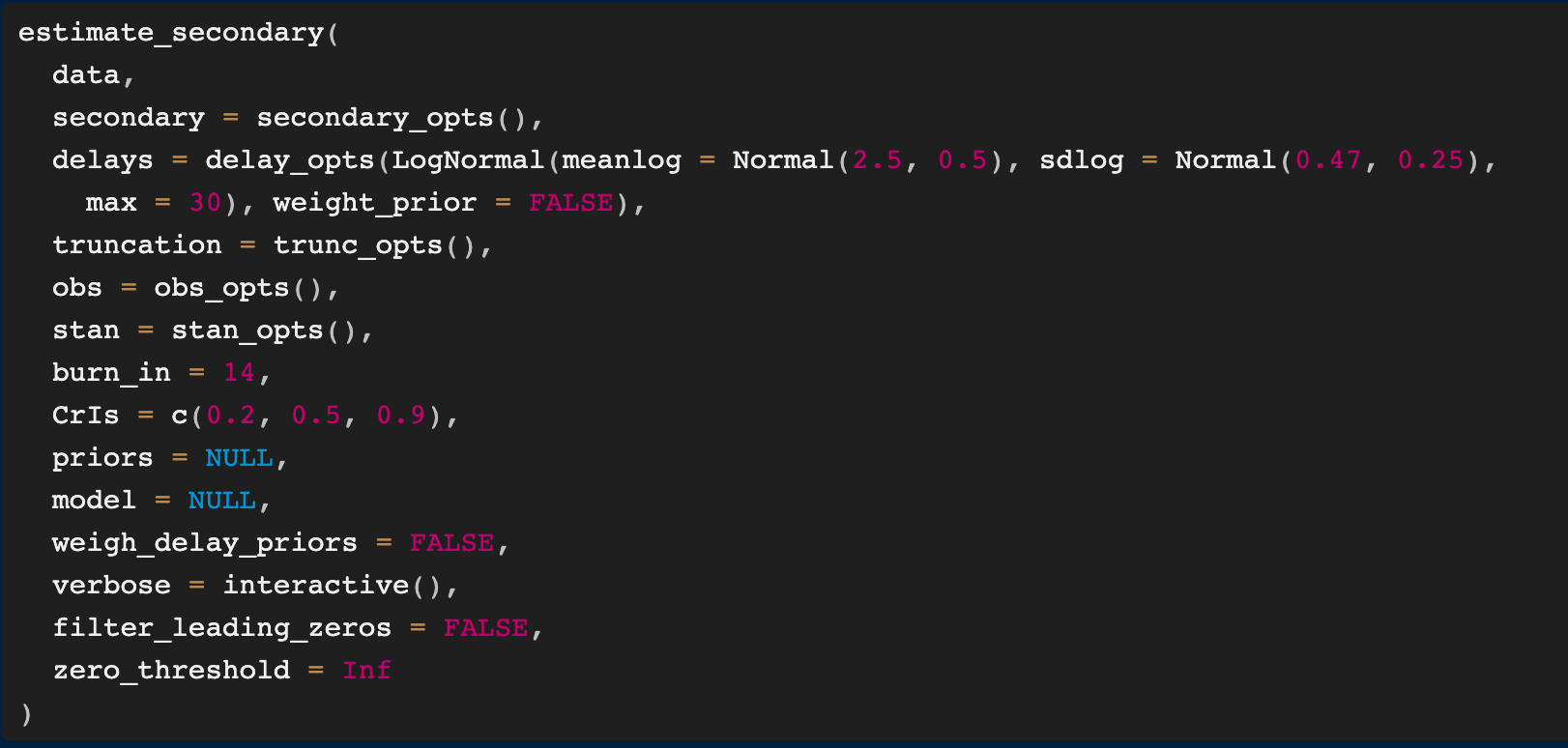 generation_time_opts()/gt_opts()delay_opts()obs_opts()EpiNow2's bespoke distribution interface: