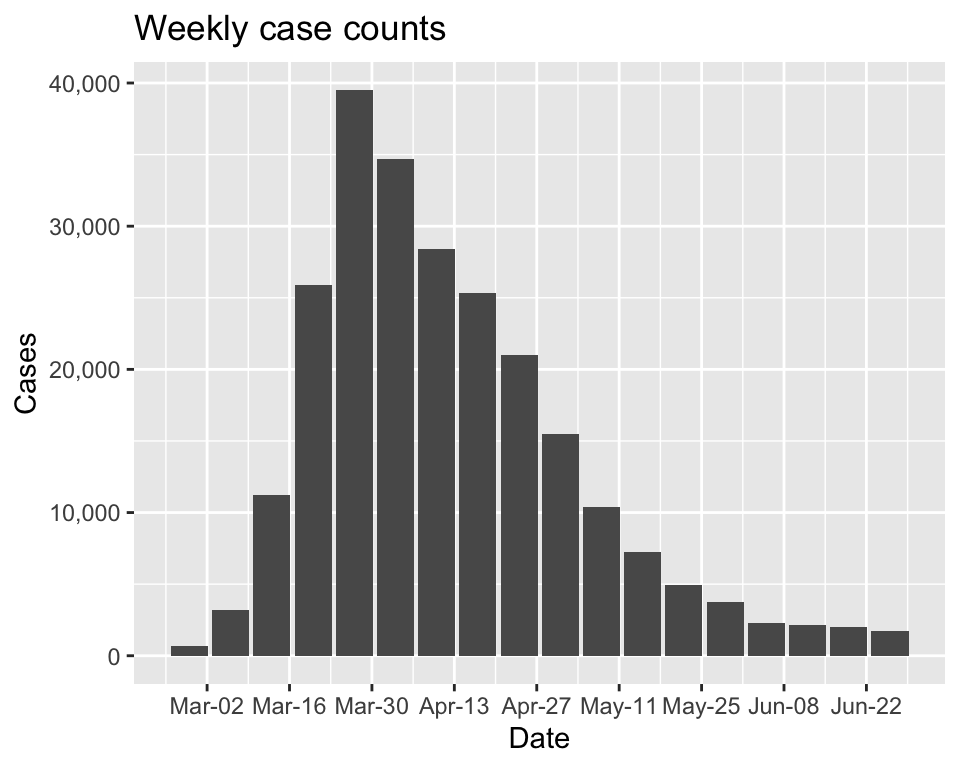 labs(title = "Weekly case counts", x = "Date", y = "Cases")# Create compatible data for EpiNow2