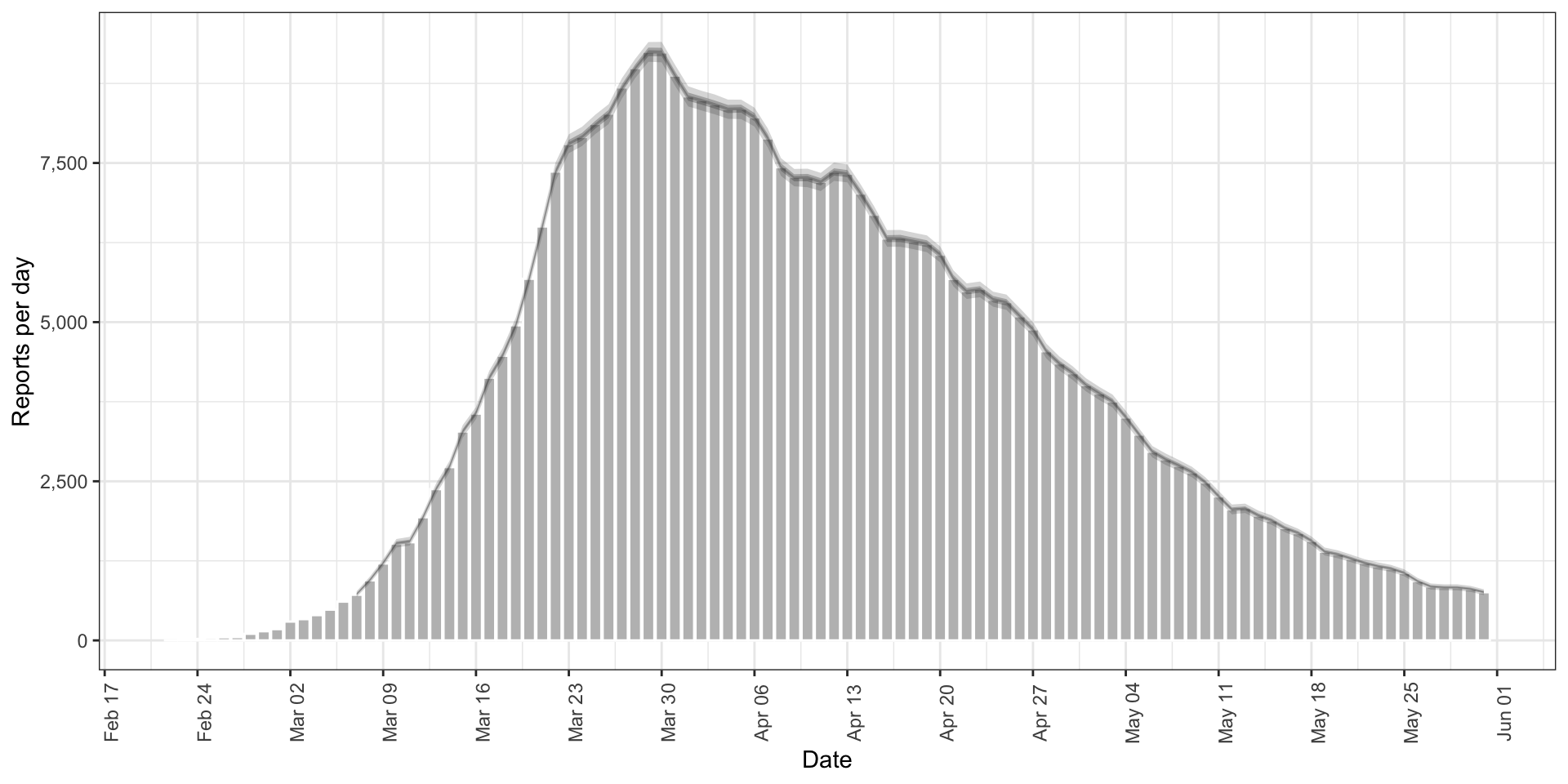 p <- ggplot(cases_weekly, aes(x = date, y = confirm)) +